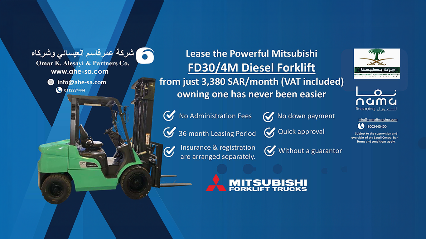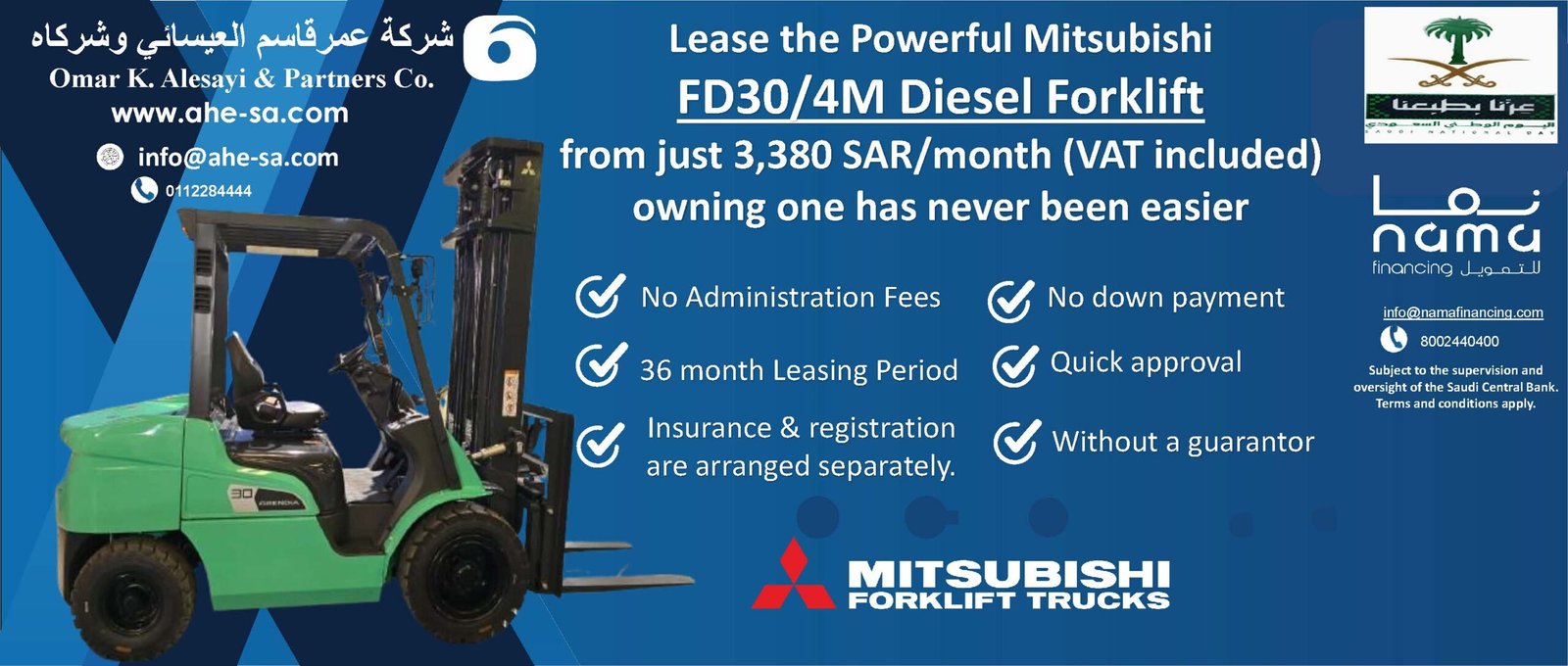 Own a new Mitsubishi diesel forklift 3-ton, 4 m lift (FD30PT/4M) from SAR 3,380/month (VAT included), in partnership with Alesayi and Nama Financing.