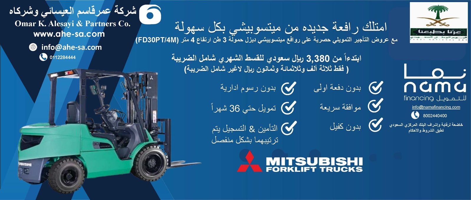 امتلك رافعة ميتسوبيشي ديزل 3 طن – ارتفاع 4م (FD30PT/4M) بقسط شهري يبدأ من 3,380 ريال شامل الضريبة، بالتعاون بين العيسائي ونماء للتمويل