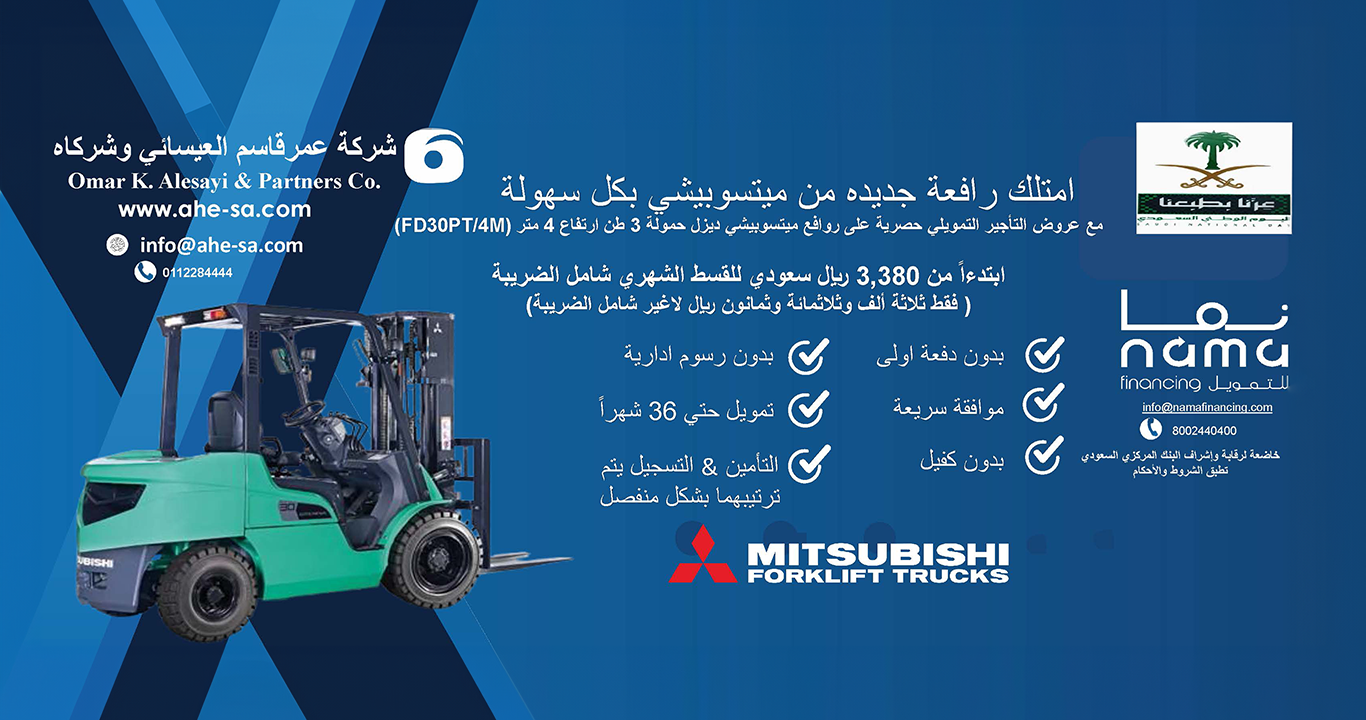 امتلك رافعة ميتسوبيشي ديزل 3 طن – ارتفاع 4م (FD30PT/4M) بقسط شهري يبدأ من 3,380 ريال شامل الضريبة، بالتعاون بين العيسائي ونماء للتمويل